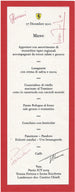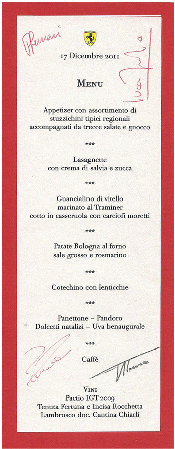 Ferrari 2011 Christmas Party Menu signed by Fernando Alonso, Felipe Massa, Piero Ferrari (Ferrari Vice President) and Luca Di Montmozemelo.