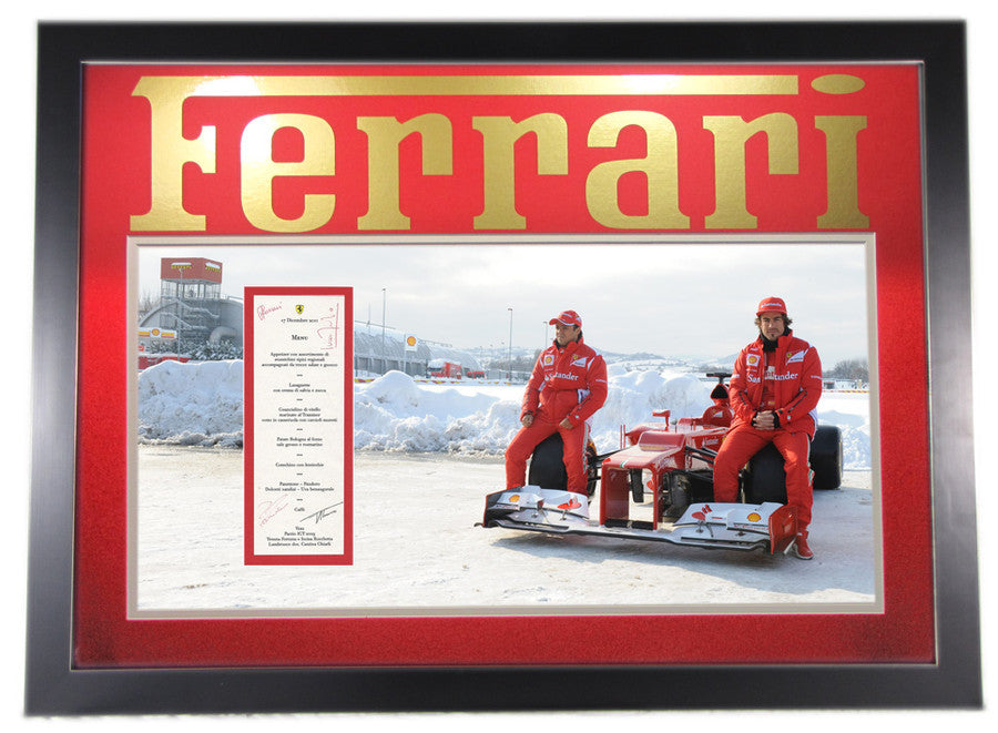 Professionally framed with a great panaramic photo of the drivers with the Ferrari F1 car.