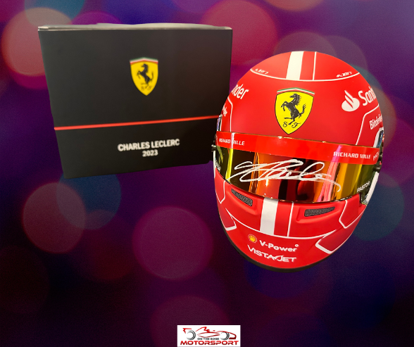 Ready to order now! The massively popular Charles Leclerc half scale 2023 Bell mini helmet, signed on the visor by Charles in Japan in September 2023.